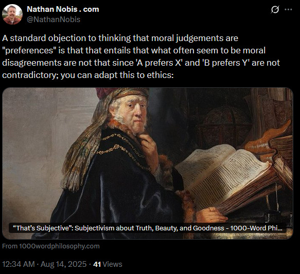 This is weak tea. Nathan links to his recent article about what laypeople might mean when they say morality is subjective, which I thought was quite bad and criticized here. This is a standard objection. It’s also a terrible objection. It only works by arbitrarily restricting the notion of a “disagreement” to a dispute about the truth of moral propositions. But not all “disagreements” are disputes about what’s true. They are often disputes about what to do.