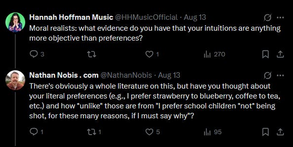 With respect to the question itself: do my taste preferences differ from my attitude towards school shootings? Sure. But none of the ways they differ have anything remotely to do with realism, e.g., perhaps I’m expected to think school shootings would be wrong regardless of my preferences or attitudes, while this would make no sense for my preference for strawberries over blueberries. But that difference isn’t present in my appraisal of food preferences and moral considerations. Both seem to me to be a kind of preference, albeit ones for which I have very different attitudes and reactions.