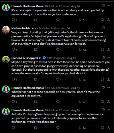 I can’t say I disagree. One might very well have reasons for their preferences. But it doesn’t seem to me that preferences require reasons, whether moral or nonmoral. Even so, this shows a route by which one might approach the matter: one could argue that neither moral nor nonmoral values “seem” to be subject to rational assessment (my approach), or one might argue that both appear to be subject to rational assessment and/or that one can provide reasons for those preferences. I don’t endorse the latter approach but it does strike me as more plausible than thinking preferences aren’t subject to rational assessment but moral considerations are. But who cares how plausible things seem to me? How plausible things seem to different people will vary, so this isn’t a good way to try to settle these matters in the first place. And if plausibility is all you have, maybe you should reconsider your methods or your intellectual endeavors.