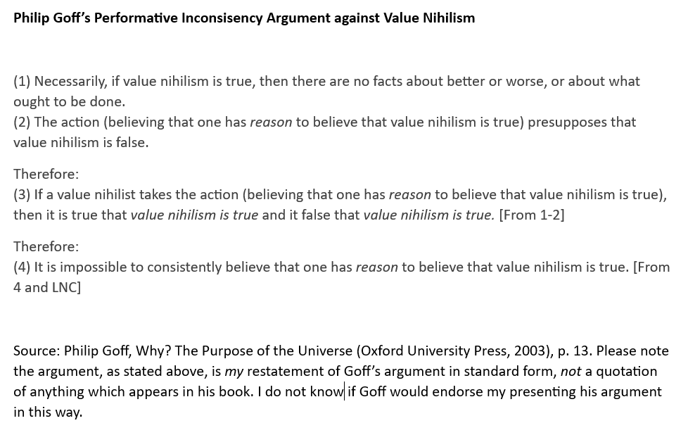 This argument only works against a very stupid nihilist. This argument does not show in any way that there is a contradiction or any kind of error in being a value antirealist, that is, someone who denies there are stance-independent value facts. The “value nihilist” is someone who, as a matter of stipulation, holds contradictory views. Well, of course a person who you stipulate has contradictory views has contradictory views. But actual antirealists like myself are not necessarily going to endorse all the assumptions that are packed into the premises of the argument presented here. At least one possible response would be to deny (P2). A “value nihilist” could simply deny that one “has reason to believe that value nihilism is true.” Alternatively, a value nihilist could just accept the conclusions of this argument. After all, neither argument actually shows that value nihilism is incorrect or self-defeating. All it shows is: