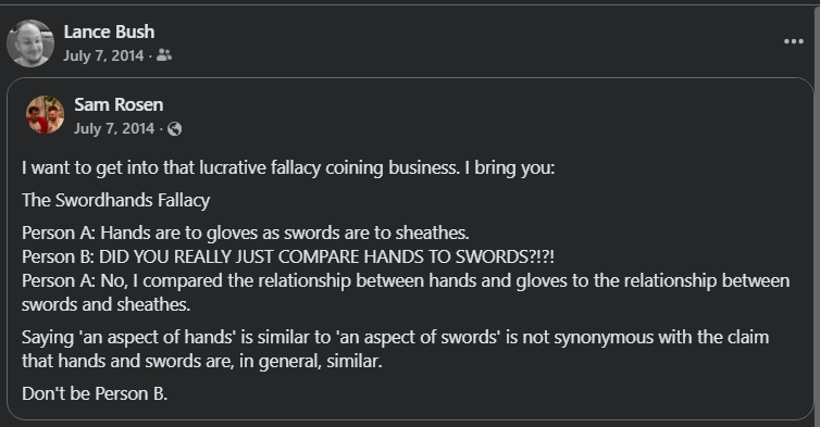 Either way, I’m happy to cede the origin of the fallacy to Sam. There is a very good chance that I got the idea to recognize this as a distinct fallacy directly from Sam and the notion rolled around in my mind for a decade or so until I decided to write about it here. Regardless, Sam deserves whatever credit there is for distinguishing this mistake first (unless someone preceded both of us). More generally, Sam is an incredibly creative thinker who is especially good at insightfully novel notions. [End Edit]