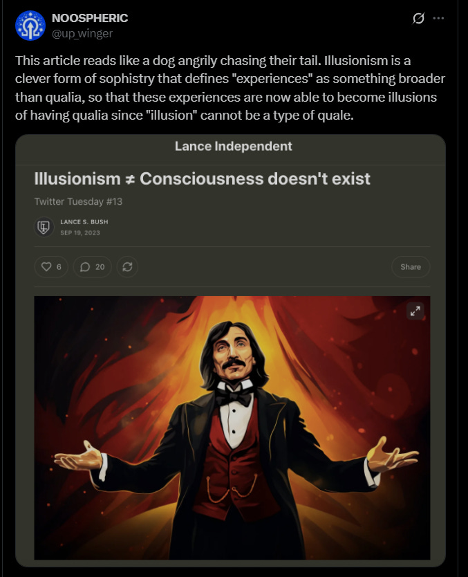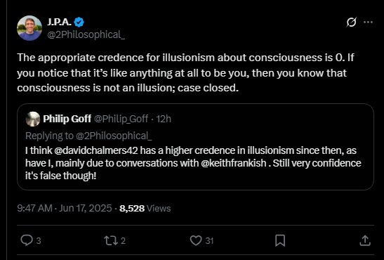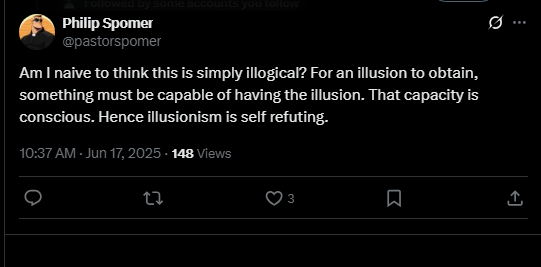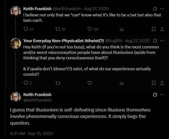 I’m not the first person to notice this bizarre, question-begging reaction to illusionism. Keith Frankish, a prominent contemporary proponent of illusionism, explicitly noted this himself. Have a look at this exchange from over five years ago: