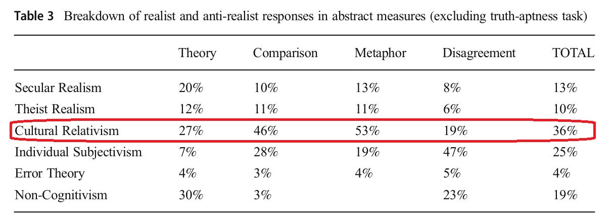 Note, for instance, that they claim that “almost everyone rejects it once they understand its implications.” This is an empirical claim. Yet they provide no empirical evidence to support this claim. There is some empirical evidence that suggests otherwise. Consider the paper I routinely cite here from Pölzler and Wright (2020). Pölzler and Wright do something that most studies on the psychology of metaethics don’t: they provide training exercises and rich descriptions of metaethical positions to participants, and use a variety of other measures to enhance and confirm that participants have familiarized themselves with the relevant metaethical distinctions. There are methodological problems with this, which I’ve discussed in my own work, but what’s notable about these practices is that this is one of the rare cases where researchers went out of their way to explain relativism to participants. Their characterization of “cultural relativism” is a bit ambiguous, but is consistent with an agent relativist reading. Here are some of the descriptions they give: