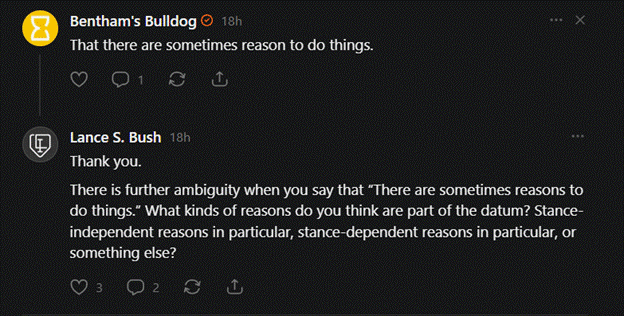 It’s been several days since I asked, but at the time of writing he has not responded. At this point I don’t expect a response. So we’ll proceed with this question unanswered. Note how I included a third option. The “reasons” Bentham takes to be the datum could be stance-independent reasons, stance-dependent reasons, or they could be something else. This could be a combination of the two (“reasons pluralism”), or he might believe there’s a determinate answer but he doesn’t know (“reasons agnosticism” I suppose), which would be consistent with pluralism, or he might go another route entirely, and suggest that the reasons in question are reasons tout court, i.e., simply “reasons” without further qualification. This possibility was suggested by @Tower of Babble, who said: