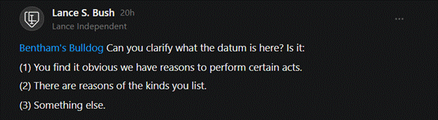 This confirms that the “datum” we are to accept is that “there are sometimes reasons to do things.” Unfortunately, this doesn’t address a second ambiguity. Following this response, I asked Bentham:
