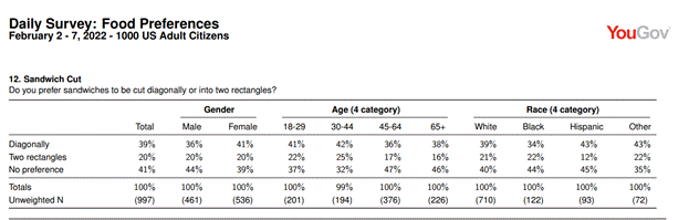 As you can see, about twice as many people prefer the triangle cut to the rectangle cut. Why might people have such a preference? This is not, to my knowledge, a topic that has been adequately explored by psychologists, but that’s just it: there may very well be an answer. This article speculates that a diagonal cut may result in a sandwich that is: