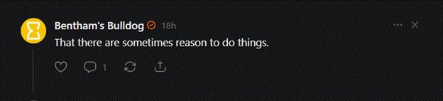 In a recent post, “Reasons and Moral Anti-Realism,” Bentham’s Bulldog raises an objection to moral antirealism: namely, that moral antirealism can’t account for genuine “reasons.” This is taken to be some sort of severe shortcoming with moral antirealism. It isn’t, and Bentham continues a pattern of offering tepid objections to antirealism. For previous critiques of Bentham’s takes on metaethics, see here: