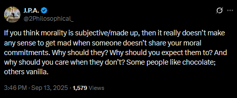 “If you think morality is subjective/made up, then it really doesn’t make any sense to get mad when someone doesn’t share your moral commitments. Why should they? Why should you expect them to? And why should you care when they don’t? Some people like chocolate; others vanilla.”