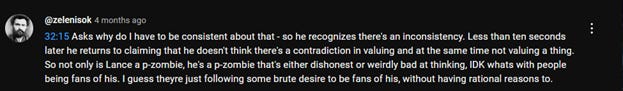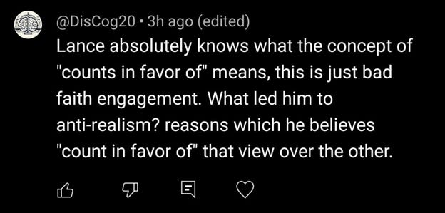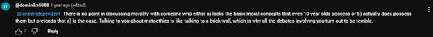 This inductive evidence forms one small part of the overarching basis I have for rejecting the intelligibility of the concept. And yet unscrupulous and dishonest people like the YouTube commenter DisCog20 ignore this and focus only on the inductive component of my objections. This can be seen in this comment exchange between myself and DisCog20, who is also one of the people who accused me of “bad faith” without any evidence in the screenshots above. I provided both inductive and abductive reasons for rejecting the intelligibility of irreducibly normative reasons. Here was a remark that I made: