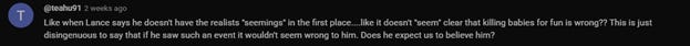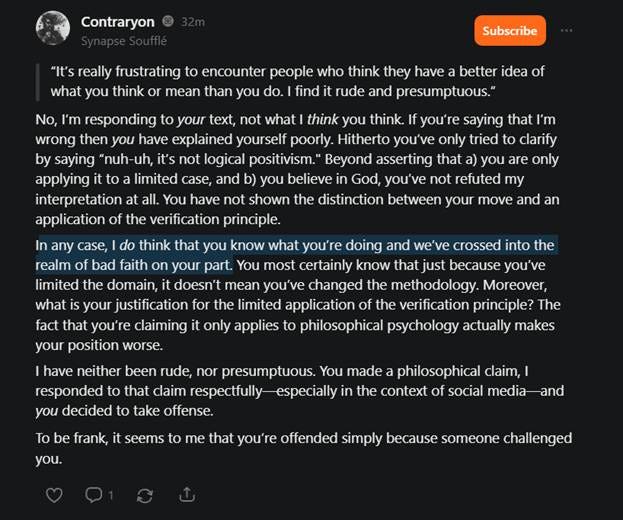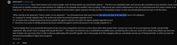A related objection to my position is that I am lying, pretending to not understand the concept in question, that I am “disingenuous,” or that I am operating in bad faith. Others have questioned whether anyone has seriously accused me of this, so I began a channel on my Discord where I and others can document accusations of dishonesty like this. Several have been directed at me. Here are a handful of examples: