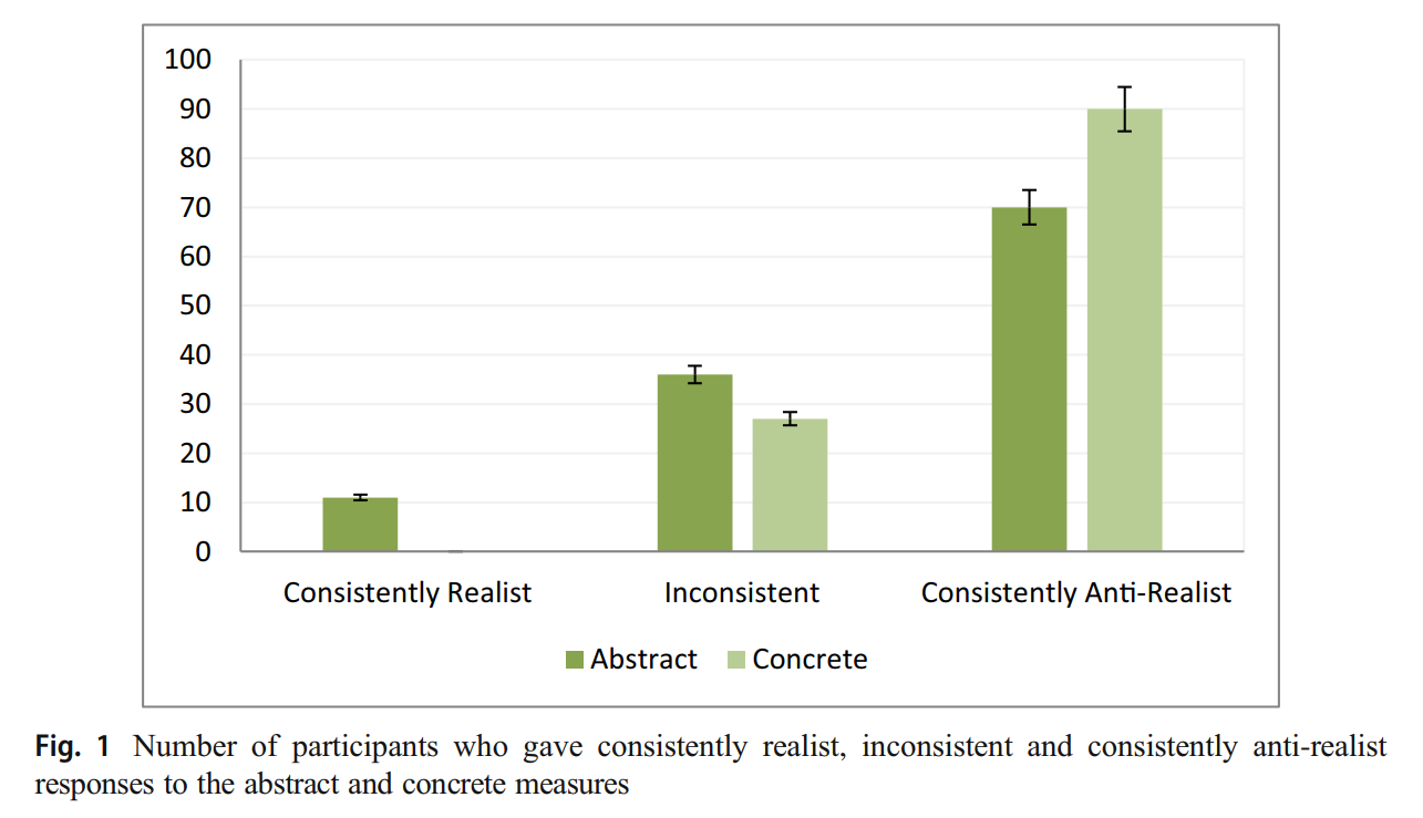 After correcting for some of the methodological shortcomings of earlier studies, and providing people with detailed instructions and training exercises to familiarize them with metaethical terms and concepts, Pölzler and Wright (2020) found that a majority of people consistently favored antirealist responses across a variety of distinct paradigms. See Figure 1: